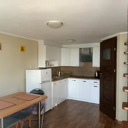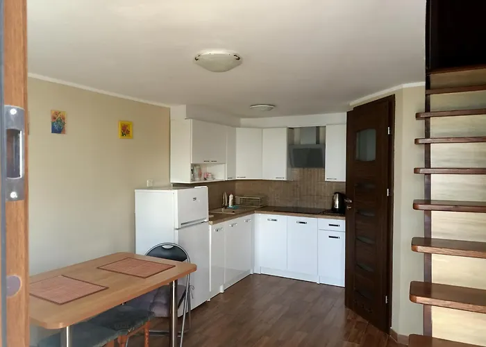 Découvrez le confort ultime dans la cuisine des appartements Domek Na Lesnej, équipée d'une bouilloire électrique, d'un réfrigérateur et de la vaisselle. L'arrêt de bus Swornegacie se trouve à côté de la résidence.